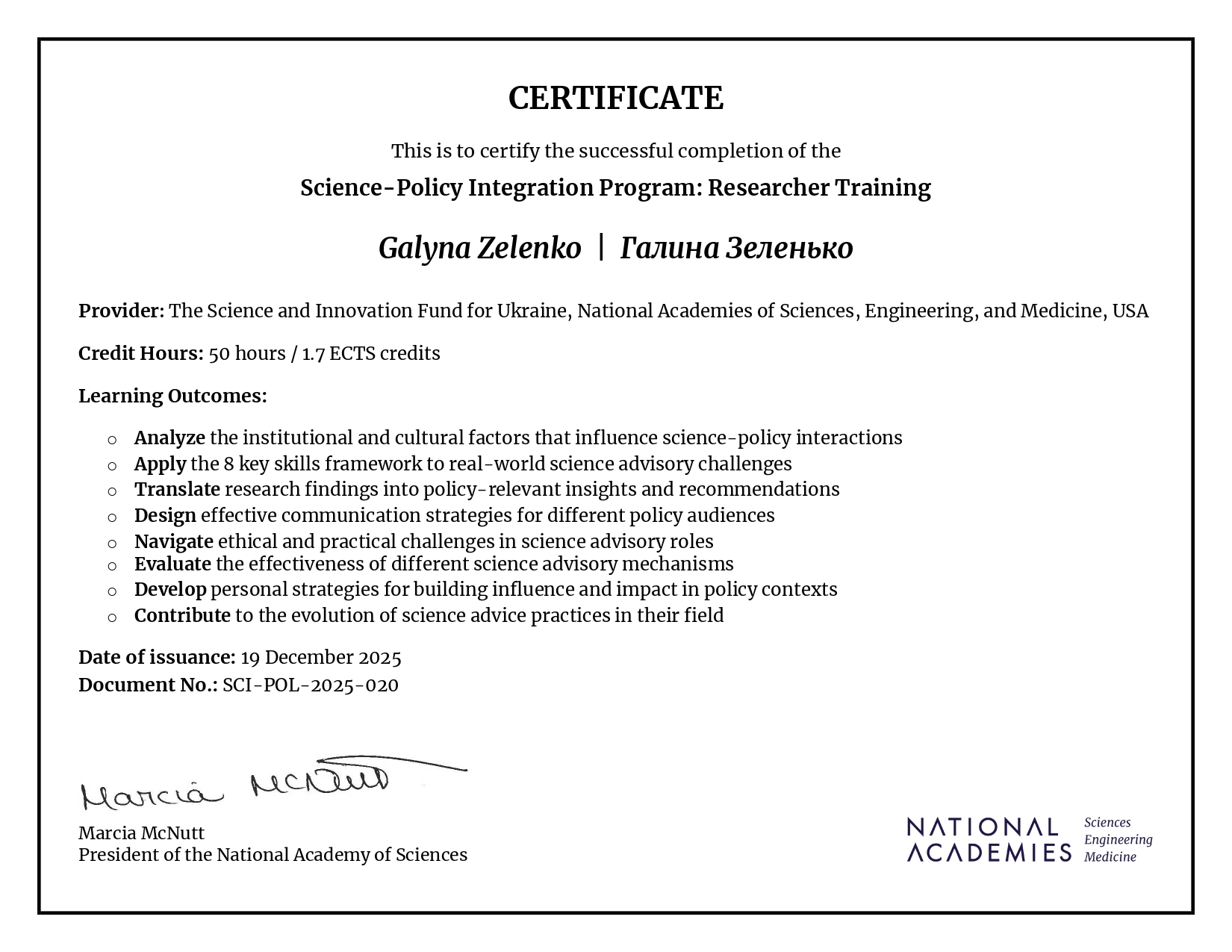 Заступниця директора Інституту політичних і етнонаціональних досліджень ім. І. Ф. Кураса НАН України Галина Зеленько пройшла чотиримісячне стажування у змішаному форматі за програмою «Science–Policy Integration», організованій National Academies of Sciences, Engineering, and Medicine (США) спільно з Національним фондом досліджень України.